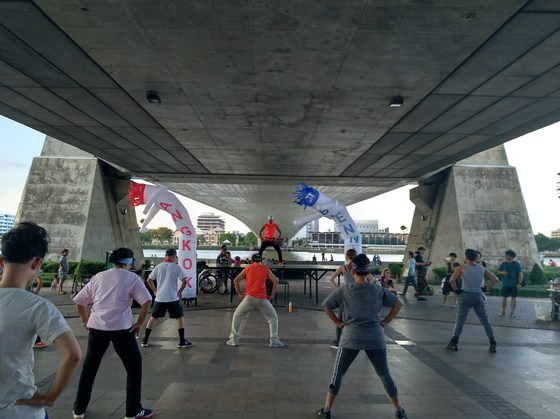 夕方のエアロビは、駅の高架下の公園、店のしまった市場の中、スーパーの前の駐車場、とバンコクではよく見かける光景だけど、今まで見た中でも、かなり集団の規模は大きい。スペースがあるっていうのと、あとロケーションもいいよな、と、最後は脱落して露店でスイカを食べながら、橋の構造を下から眺めた。