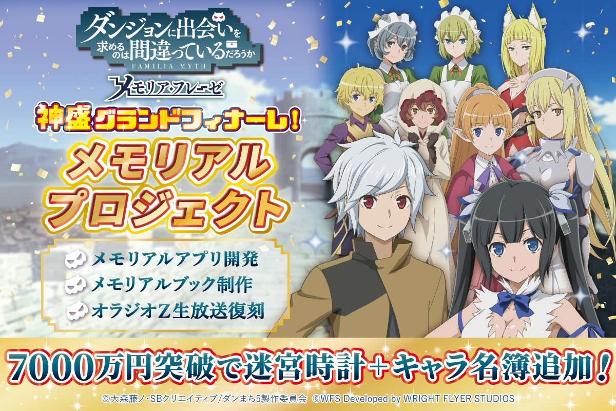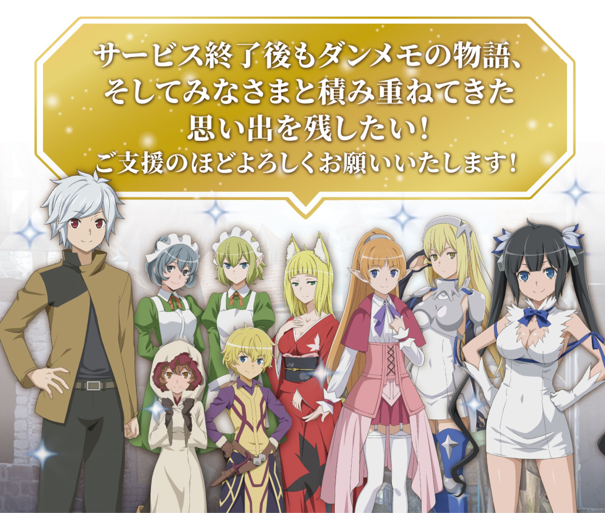 2017年6月19日より配信を開始いたしました「ダンまち〜メモリア・フレーゼ〜」ですが、2024年6月24日をもちまして、サービスの配信を終了させていただく運びとなりました。