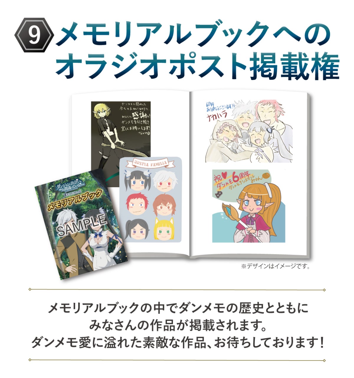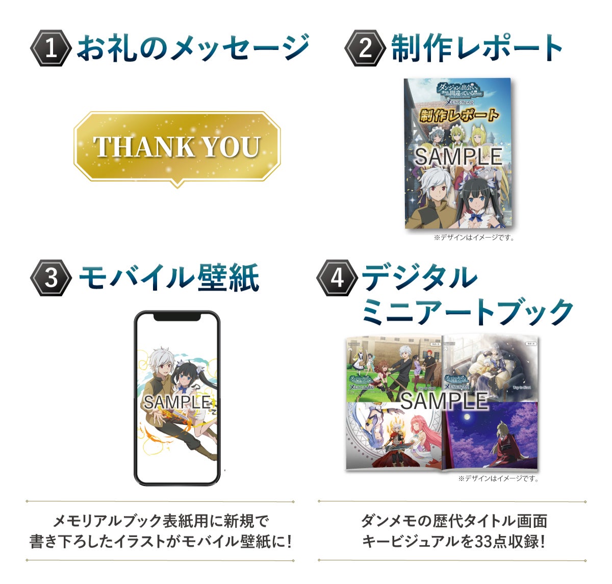 (4)デジタルミニアートブック:ダンメモの歴代タイトル画面キービジュアル33点を、デジタルミニアートブックとしてお届けします。登録いただいたメールアドレス宛に、9月下旬までにお送りします。