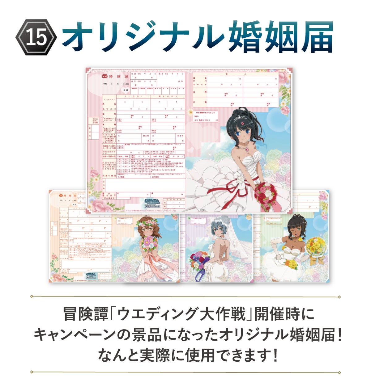 (15)オリジナル婚姻届:冒険譚「ウエディング大作戦」開催時にSNSキャンペーンのために制作した、実際にご利用いただける婚姻届です。ヘスティア・リリルカ・シル・ティオネの4パターンお届けします。登録いただいた住所宛に、9月下旬までにお届けします。