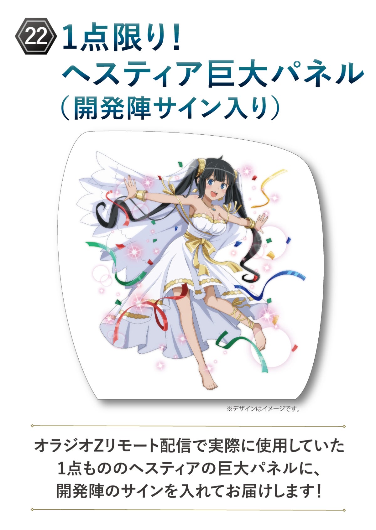 (22)(23)ヘスティア/アイズ巨大パネル:オラジオZリモート配信で実際に使用していた1点もののパネルです!こちらに開発陣のサインを入れてお届けします。登録いただいた住所宛に、9月下旬までにお届けします。