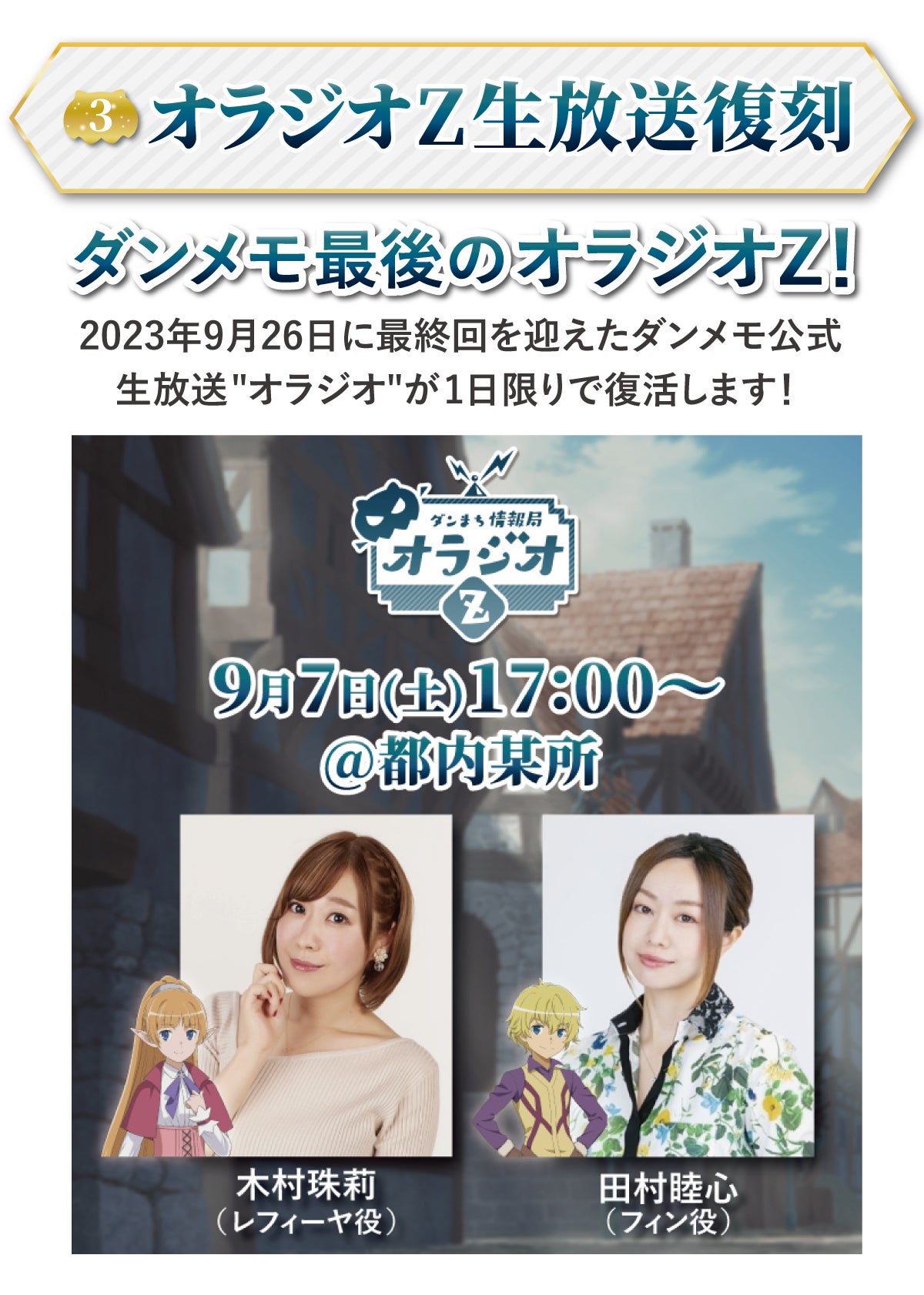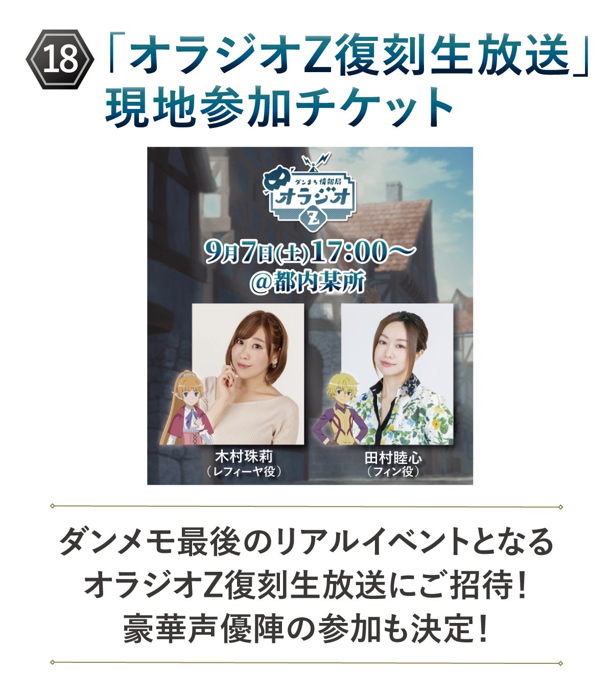 (18)「オラジオZ復刻生放送」現地参加チケット:ダンメモ最後のオラジオZの収録にご招待!9/7(土)実施のイベントに参加いただけます。支援いただいた方には、6/24(月)以降、登録いただいたメールアドレス宛に当日の詳細をお送りいたします。