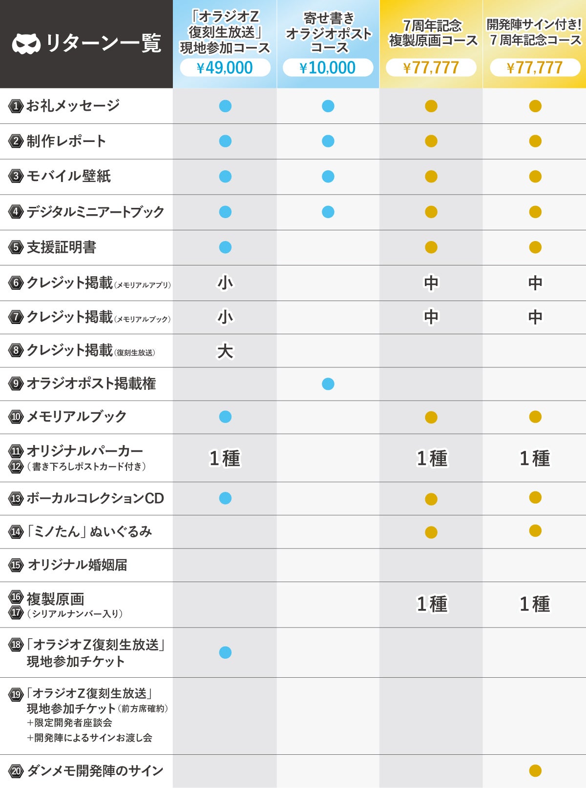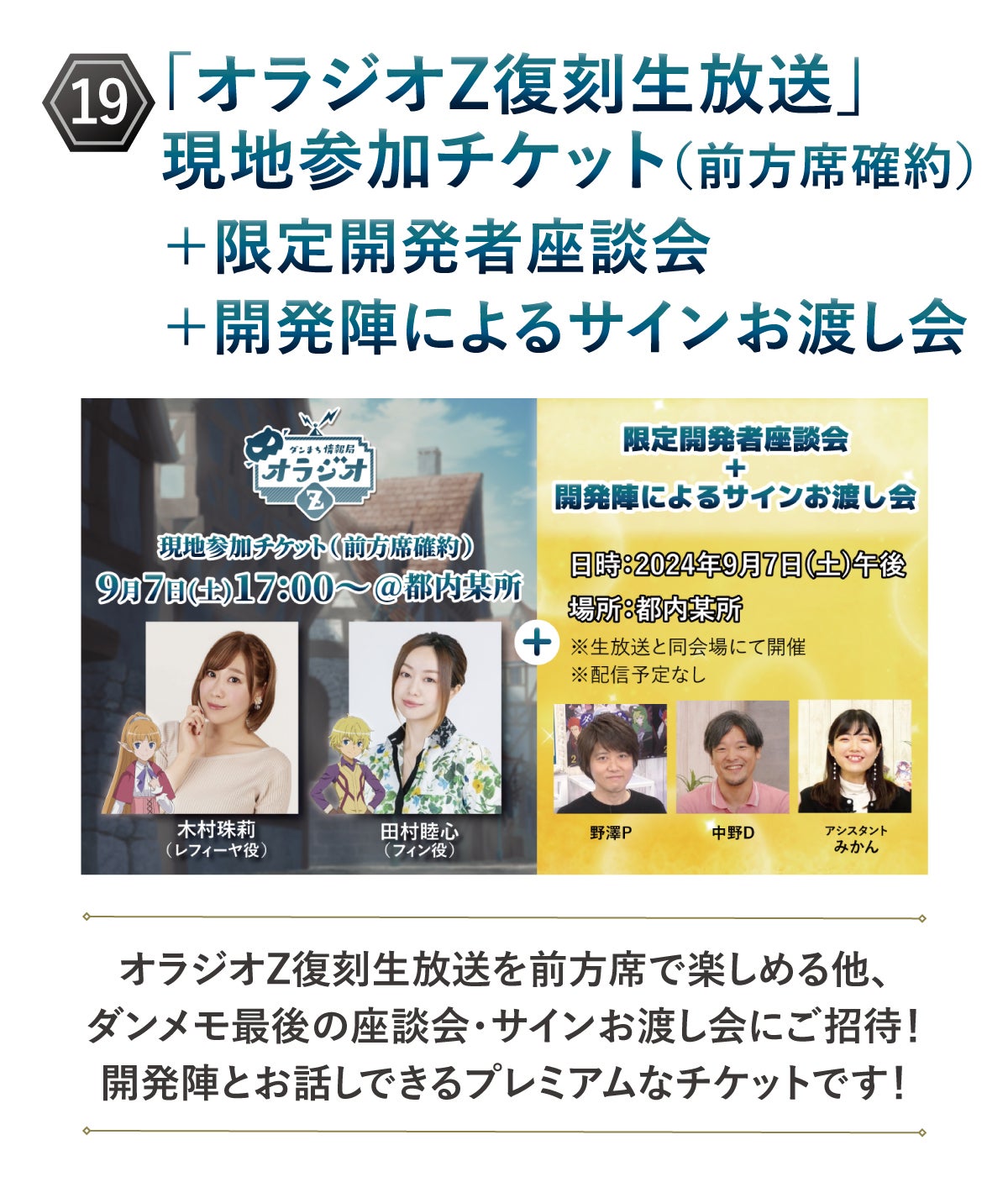 (19)「オラジオZ復刻生放送」現地参加チケット(前方席確約)+限定開発者座談会+開発陣によるサインお渡し会:ダンメモ最後のオラジオZの収録にご招待!9/7(土)実施のイベントに参加いただけます。さらにこちらのチケットはプレミアム仕様!開発陣との限定座談会や、開発陣によるサインお渡し会にもご招待!支援いただいた方には、6/24(月)以降、登録いただいたメールアドレス宛に当日の詳細をお送りいたします。