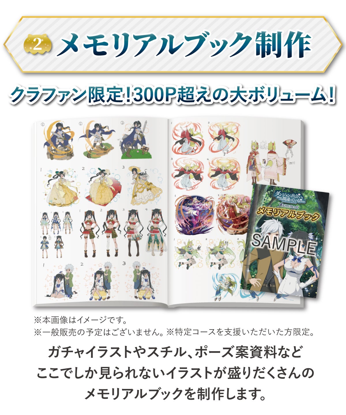 (10)メモリアルブック:クラウドファンディング限定!ガチャイラストや背景資料、ポーズ案資料などの秘蔵資料が盛り沢山!300pを超える力作です。登録いただいた住所宛に、9月下旬までにお届けします。