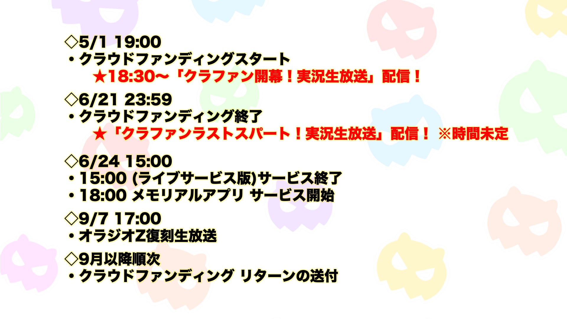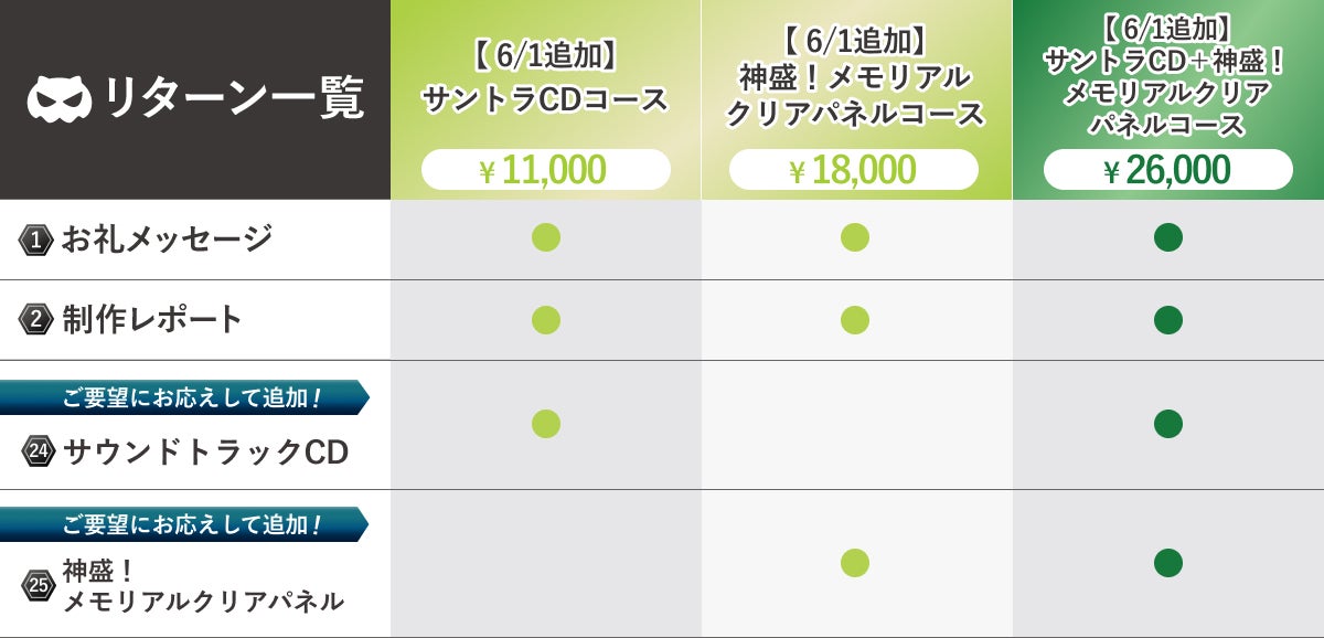 (8)クレジット掲載(復刻生放送):支援いただいた方のお名前を、9/7(土)実施の復刻生放送クレジットに記載します。お名前は、支援の際に備考欄にご記載ください。