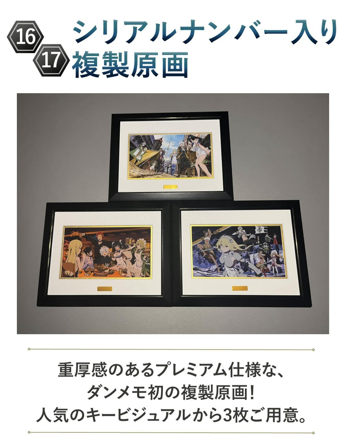 (16)複製原画:重厚感のあるプレミアム仕様な、ダンメモ初の複製原画です。3種類からおひとつお選びいただけます。シリアルナンバーはお選びいただけません。登録いただいた住所宛に、9月下旬までにお届けします。