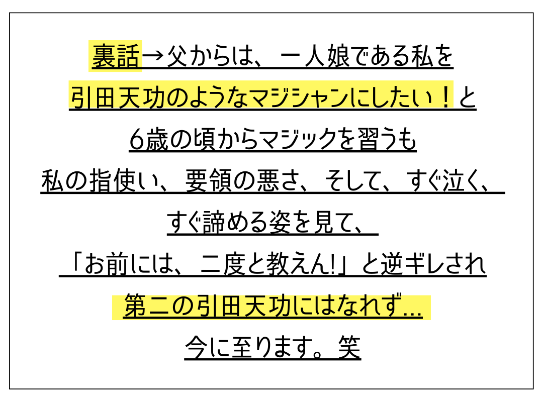 実は!小さい頃からマジシャン兼、バンドマンである父と母と一緒に、ステージの上に立ち、エンターテイメントの世界で生きてきました!
