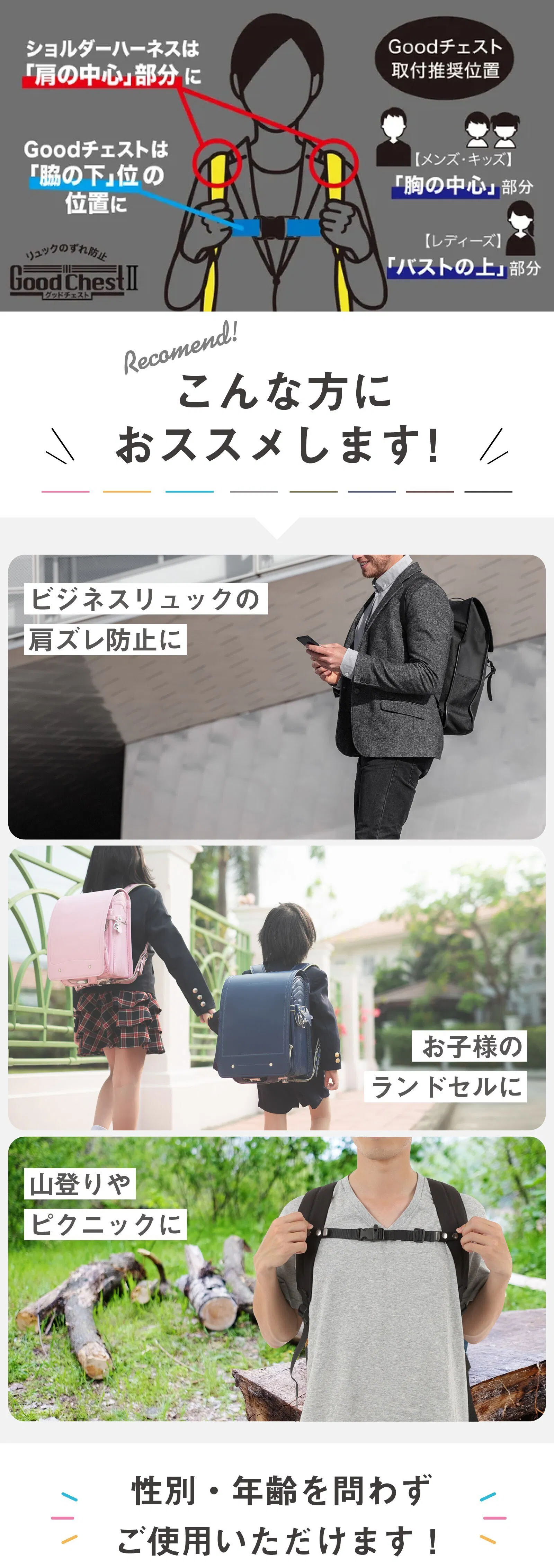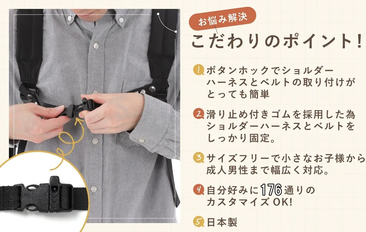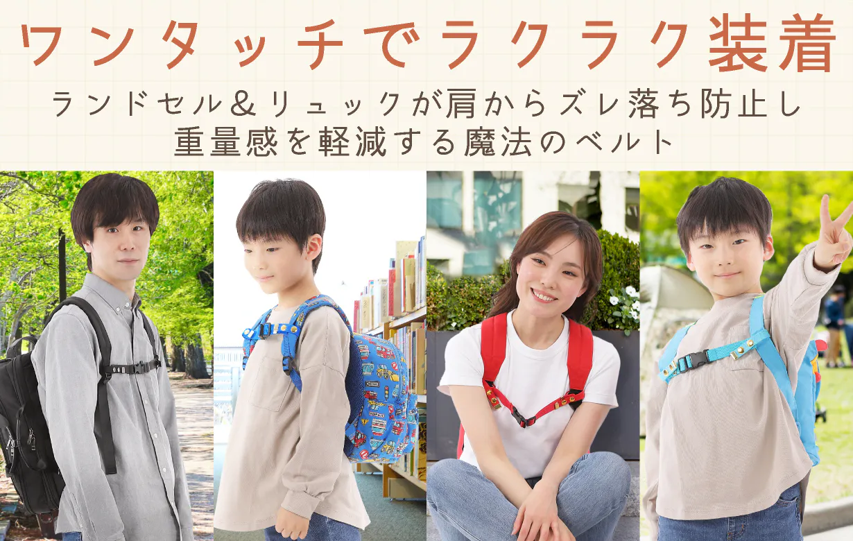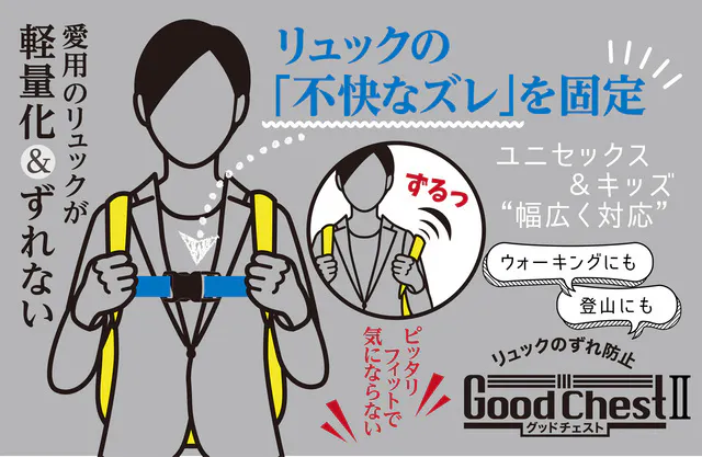 そんなお悩みを解消し、さらにリュックの重さを軽減して肩の負担を軽くしてくれる魔法のベルト「Goodチェスト」。チェストベルトがないリュックやランドセルにも簡単に装着でき、肩ベルトのズレを防止してくれると、多くの方にご愛用いただきました!