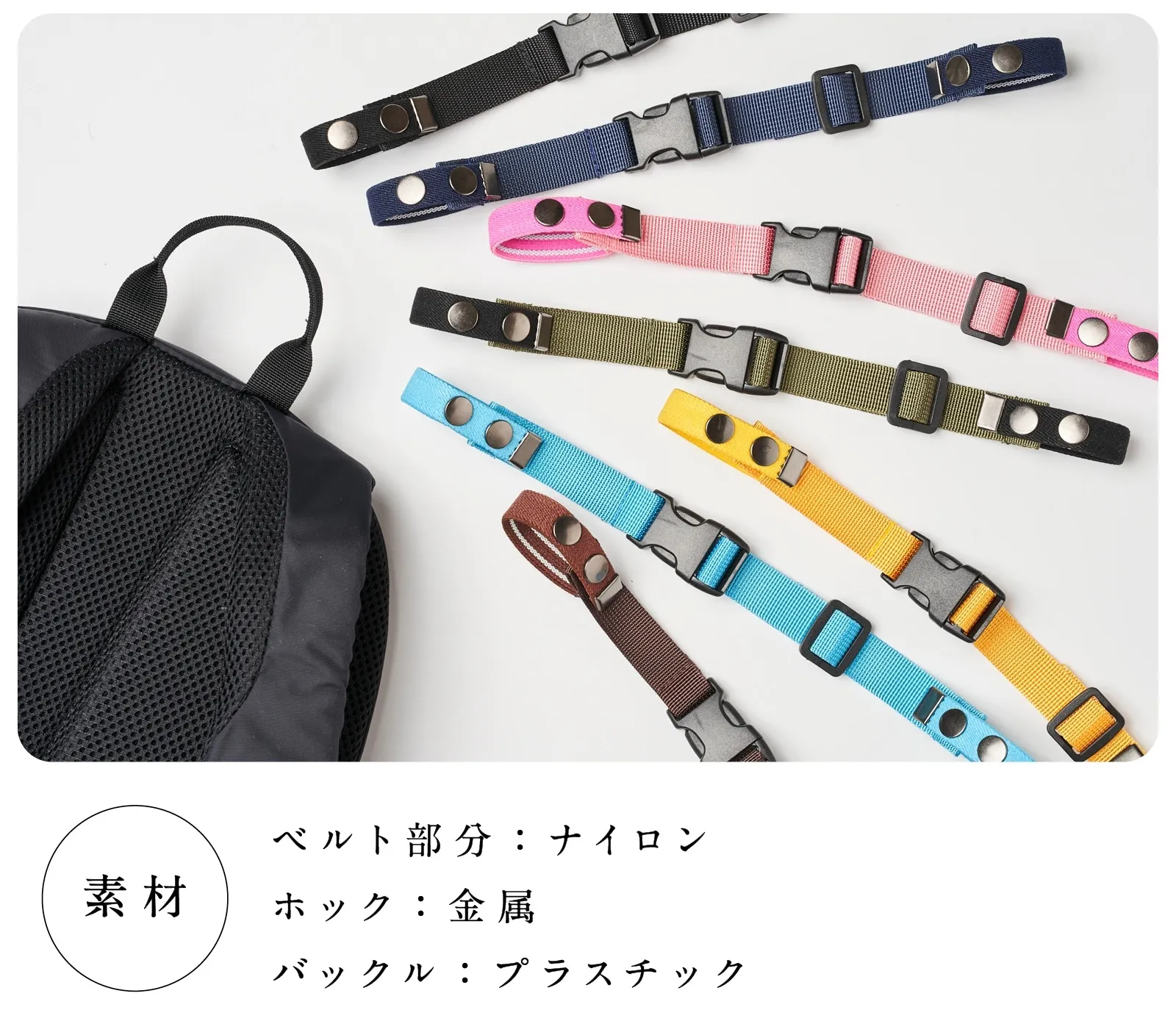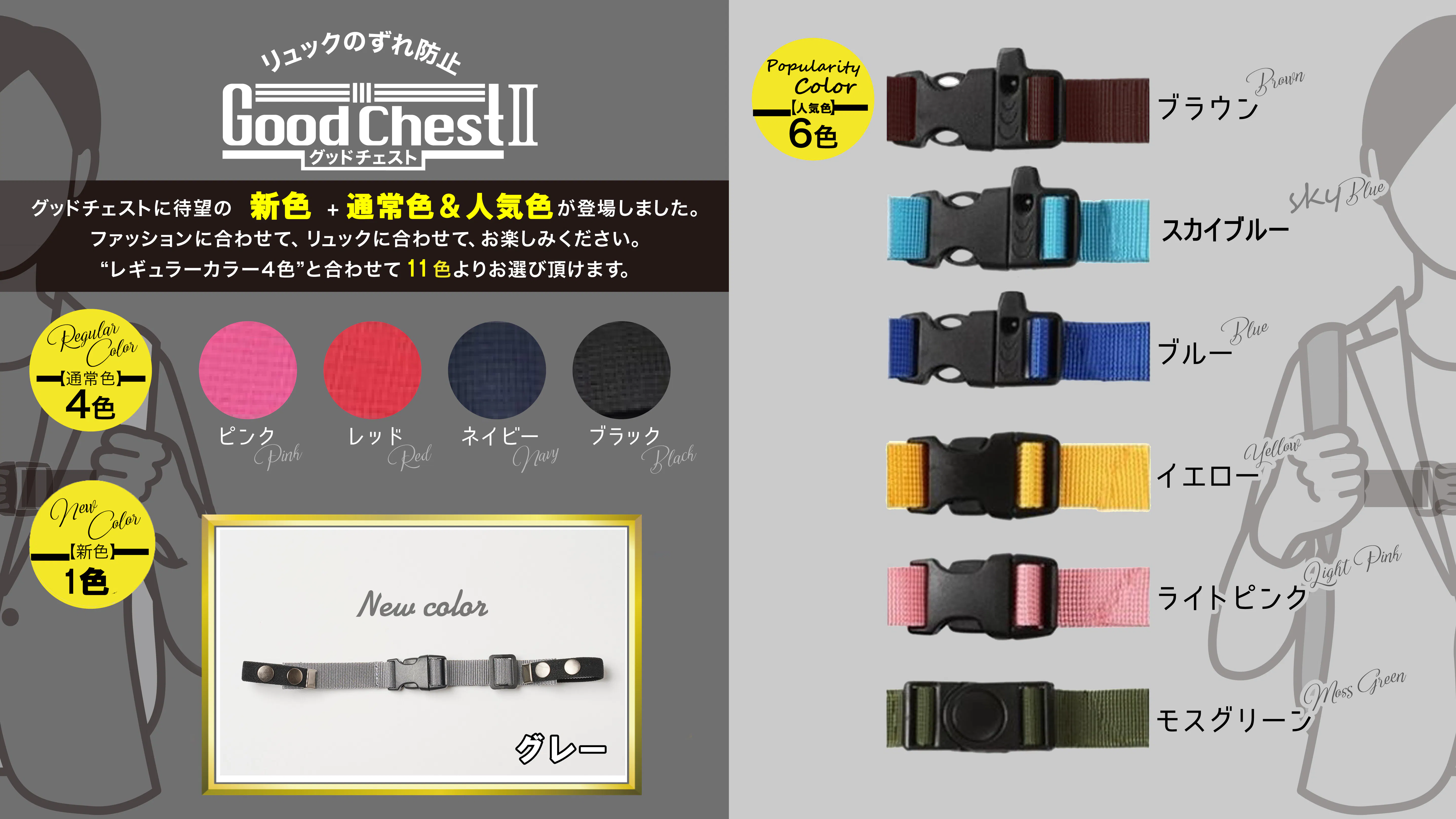 今回は、その第2弾に新バックルが登場!より使いやすく改良しました!さらに、お手持ちのどんなリュックにも使えるよう、新色も加えての御提案です!