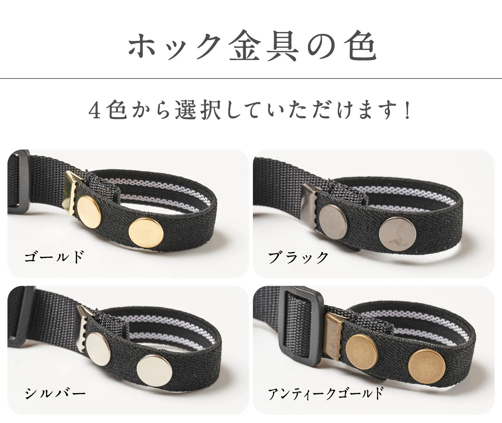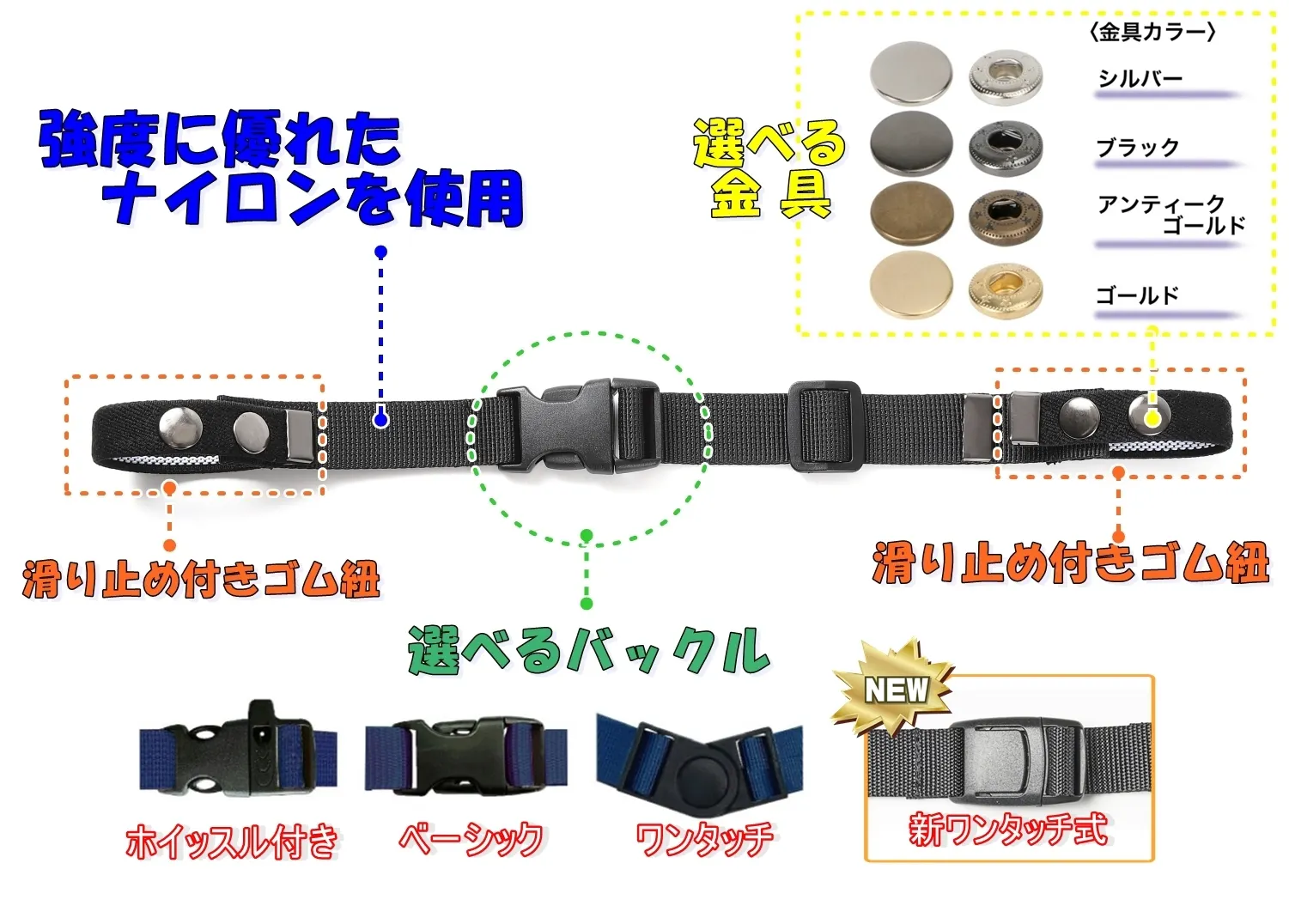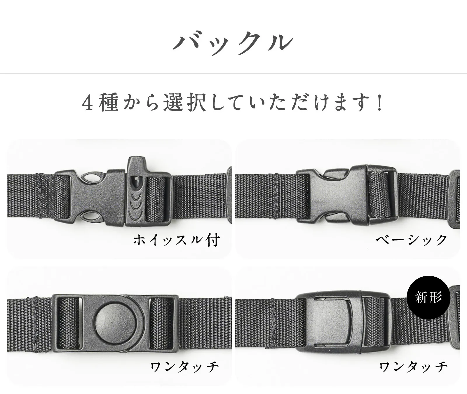 4つのバックルから選択いただけます。新しく採用した新ワンタッチバックルは、より軽い力で開閉できるようになりました!