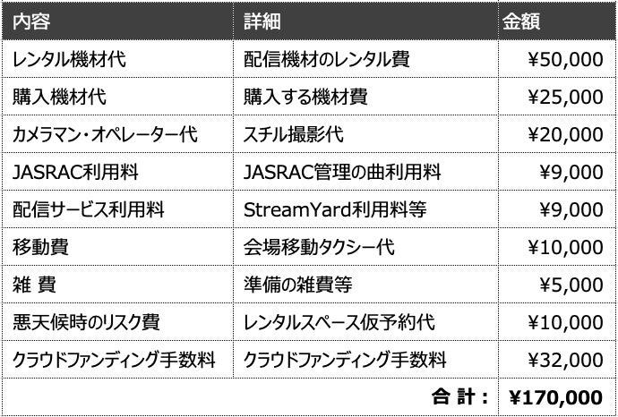 開催資金と使い道は下の通りで、約17万円かかります。