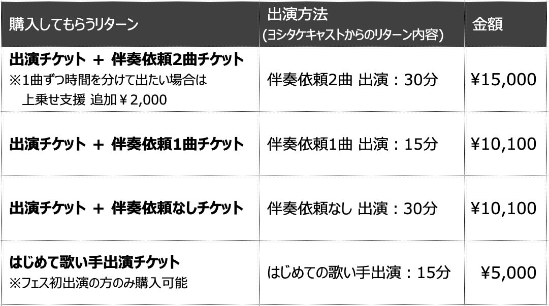 持ち時間約15分の出演枠で、ヨシタケのアコギ伴奏1曲をバックに歌って出演できます。