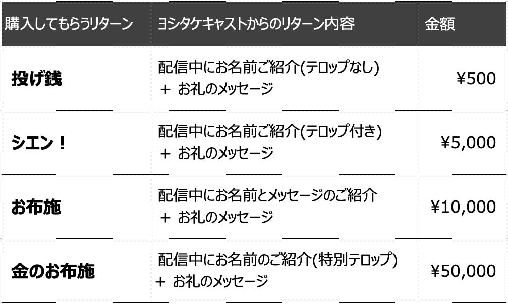 購入のリターン:配信中にお名前ご紹介(テロップなし) + お礼のメッセージ