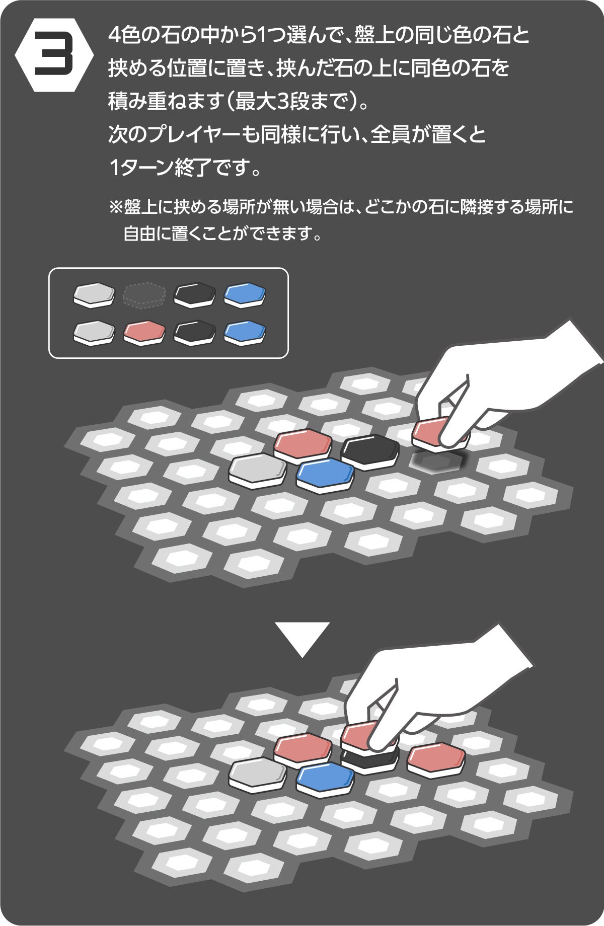・挟んだ石をひっくり返すのではなく上に重ねていくこと