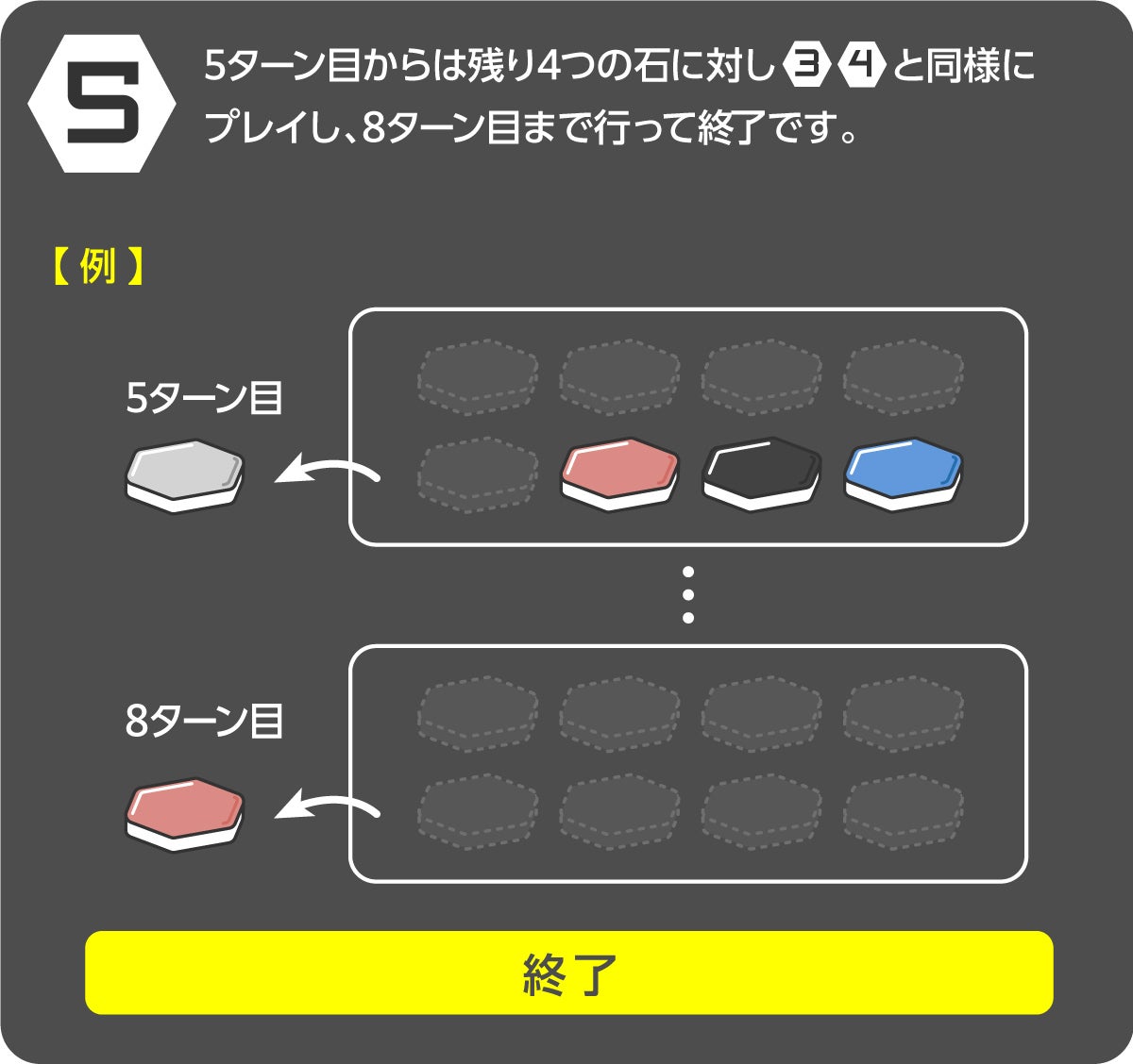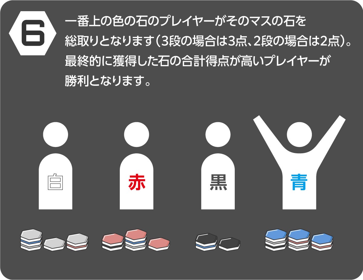 規定の手番を終え、最終的に獲得した石の数が多いプレイヤーが勝利となります。