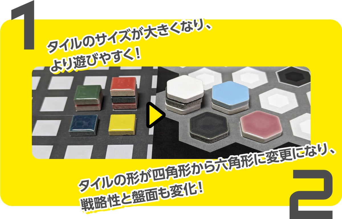 ※タイルの色は黒白赤青の4色で表示されていますが、同梱されているタイルの色は異なる場合があります(たくさんの色数のタイルを仕分けているため、タイルの色を全て同じにできないためです)。また、表紙や盤面のデザイン、タイルの数や割合についても開発中のため、変更になる可能性があります。