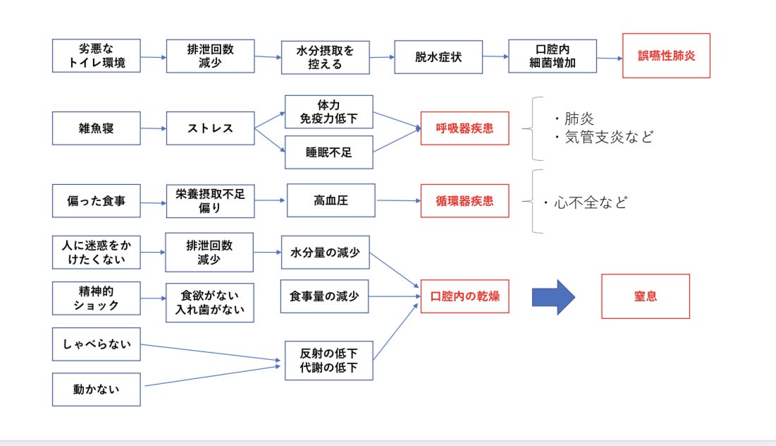 感染症、メンタル低下、栄養失調、脱水、身体機能の低下、高血圧の方や慢性疾患の人のケアが大事になってきます。