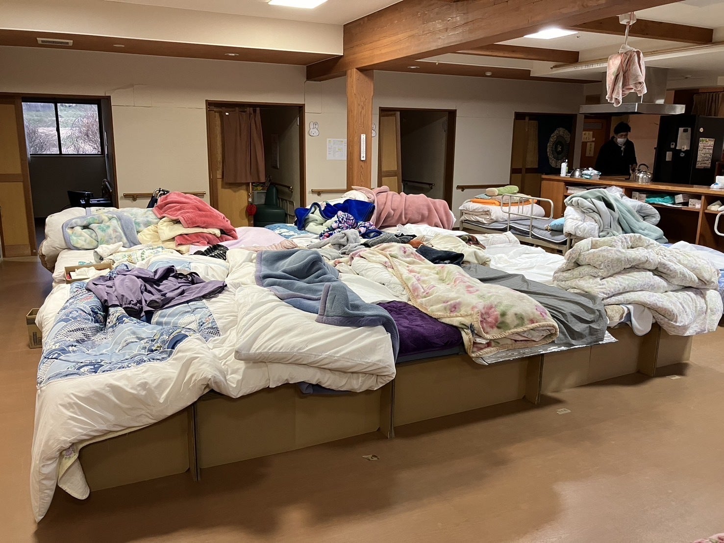避難所の住民さんの寝床(段ボール状に雑魚寝のような状態)