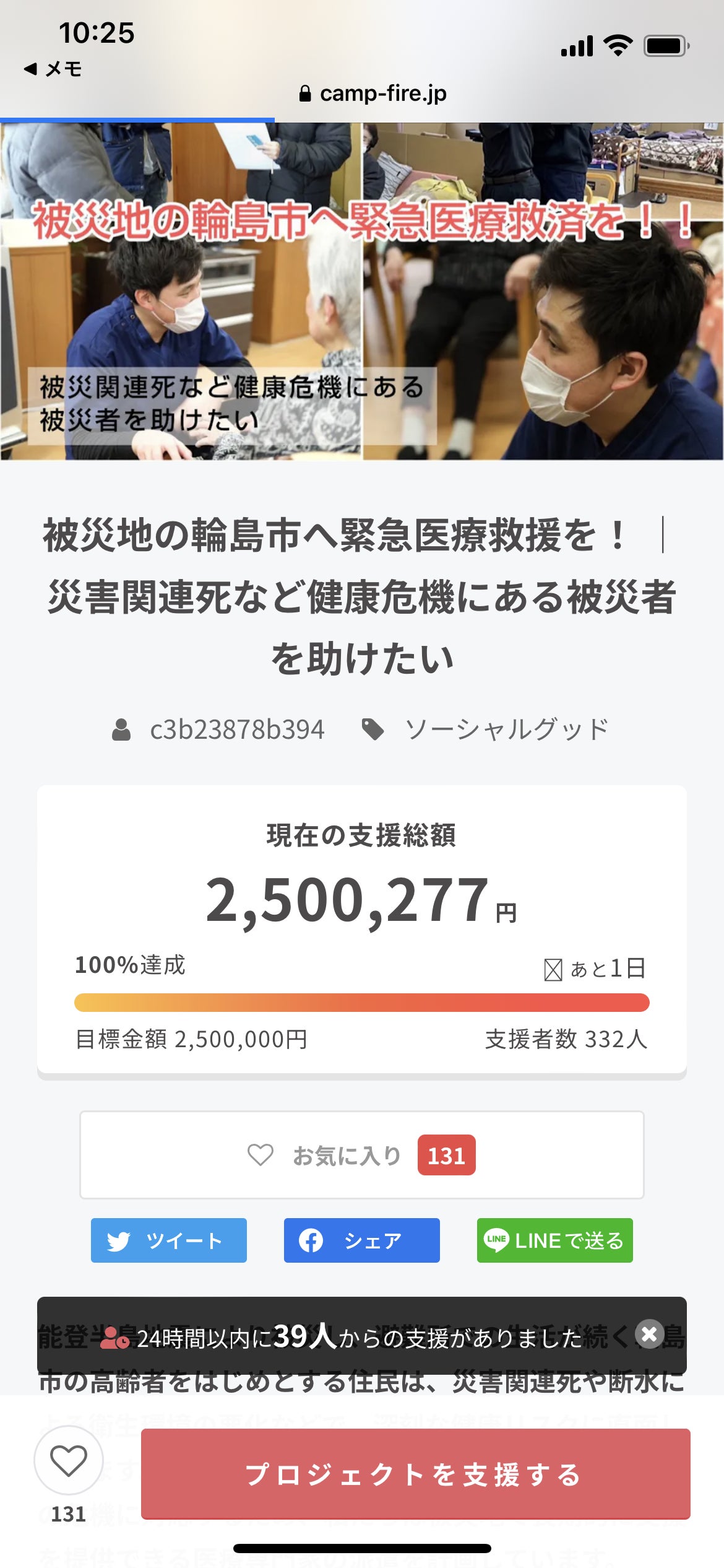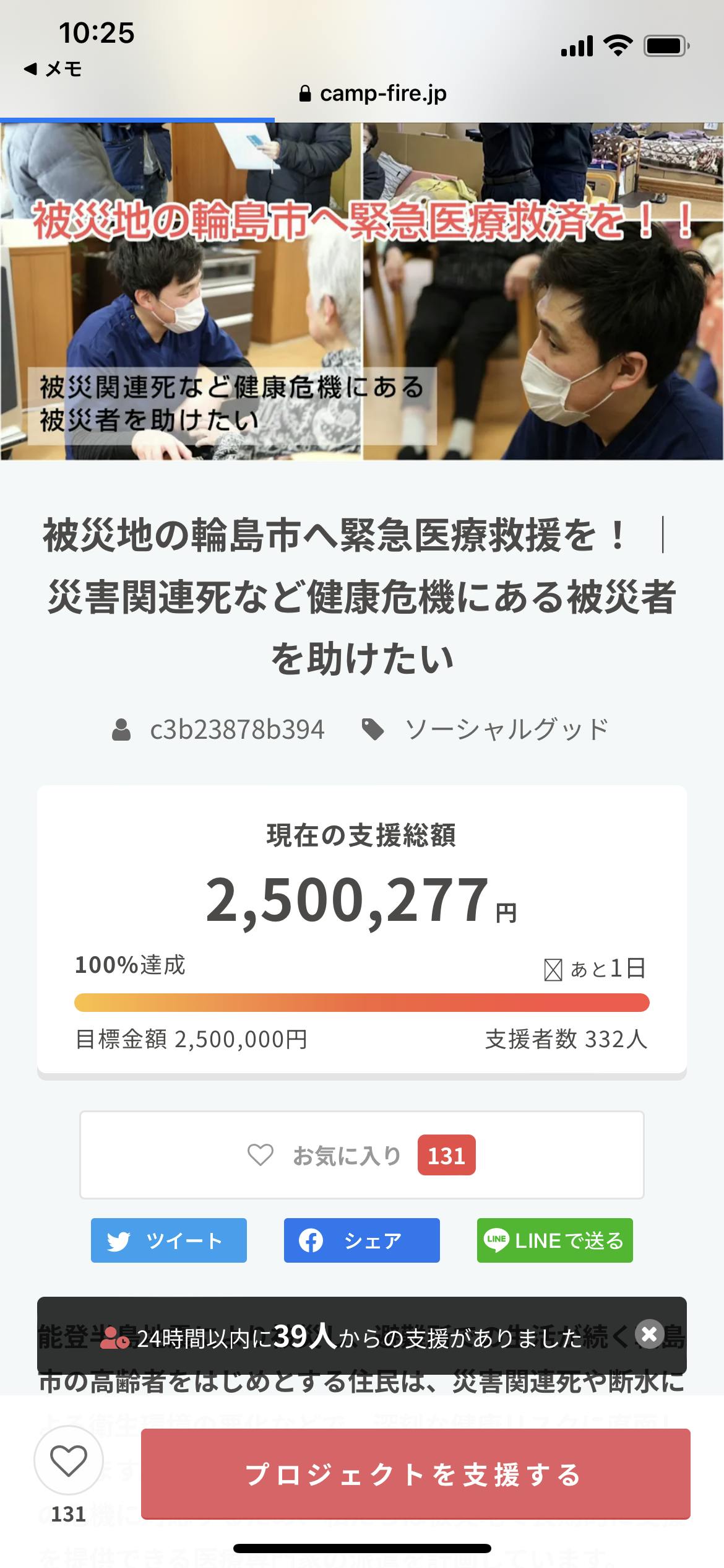 期間はあと1日です。目標金額を超えたご支援につきましては、提携させていただいて、長期間の家を貸してくださっているありんこの家、施設への物資補充にあてさせていただきます。また現場周りは車が無いと生活できず、その長期間の車レンタル代としても使わせていただきます。
