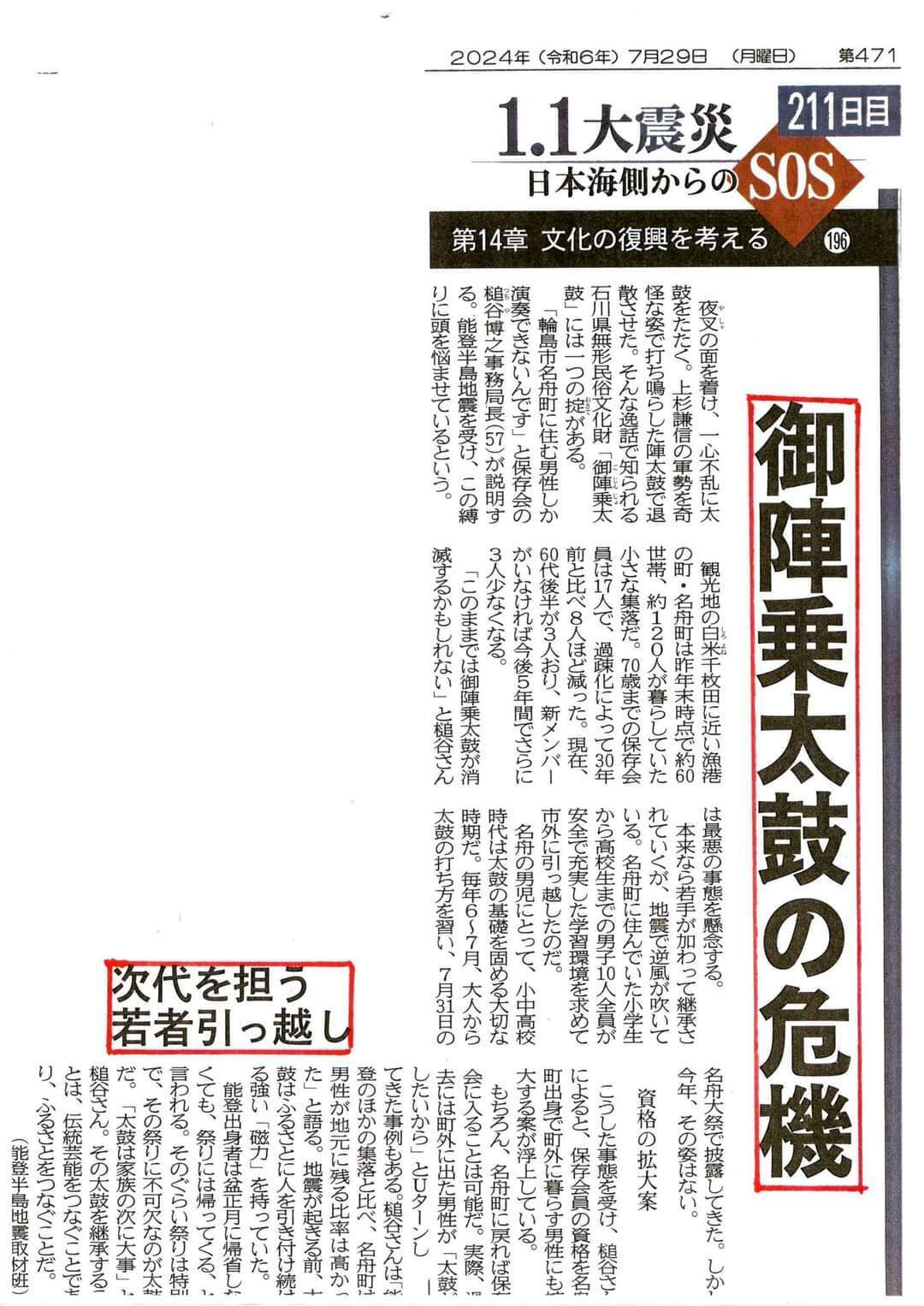 大切な能登の「御陣乗太鼓」の存続危機を救うためにも、沢山の方に知っていいただき、実際に見て、一緒に応援していただけたらと思っております。