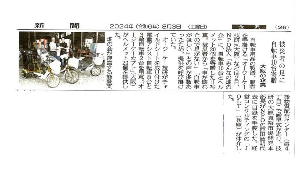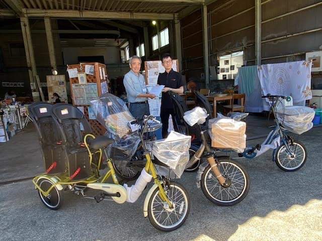 車のない被災者に、電動アシスト自転車8台、三輪自転車2台、ヘルメットを提供頂きました。