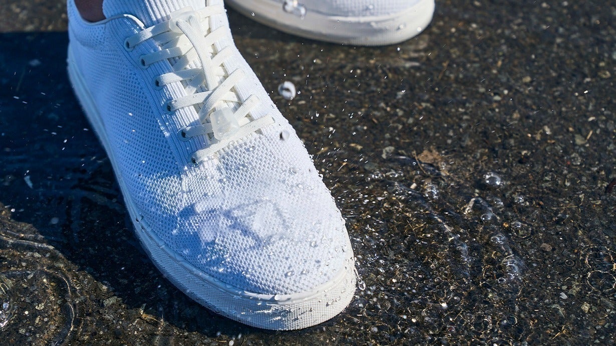 A. 雨や水たまりといった主に水を含む液体であれば、撥水性によりはじくことができます。泥やペンキといった"水で流しにくい液体由来"の汚れや、小さな砂やほこり由来の汚れは、ニットの網目に入ってしまい落としにくい場合がございます。それ以外の汚れに関しては、ふき取りや柔らかいブラシでのお手入れでも十分白さをキープできる素材です。優しく擦る程度でしたら撥水機能は落ちません。ふき取りでも落ちない汚れは、手洗いや洗濯機でのお手入れをおすすめしています。
