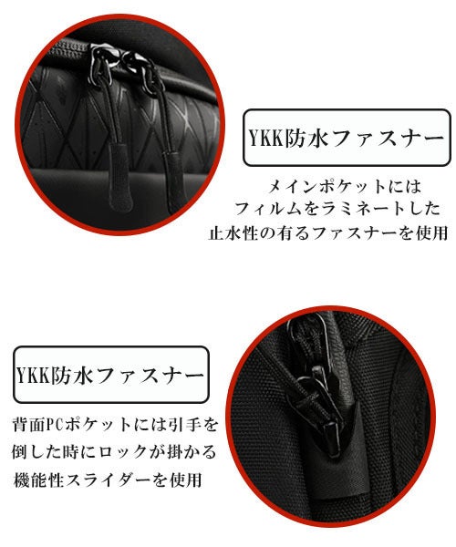 ダブルファスナーで、開閉も快適です。水を弾く撥水素材とYKK止水ファスナーにより、突然の雨でも荷物を守ってくれます。