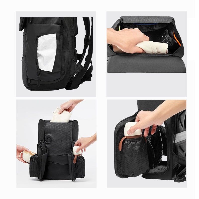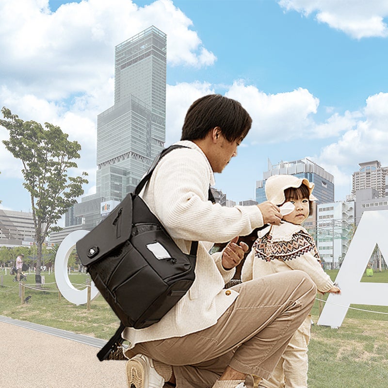 A:シンプルでスタイリッシュなデザインを採用しており、パパも気軽に持ち歩けるよう、おむつ替えや授乳アイテムを効率よく収納できるポケット構造。育児はパパも活躍する時代で、パパのお出かけもさらに楽しく便利になります!
