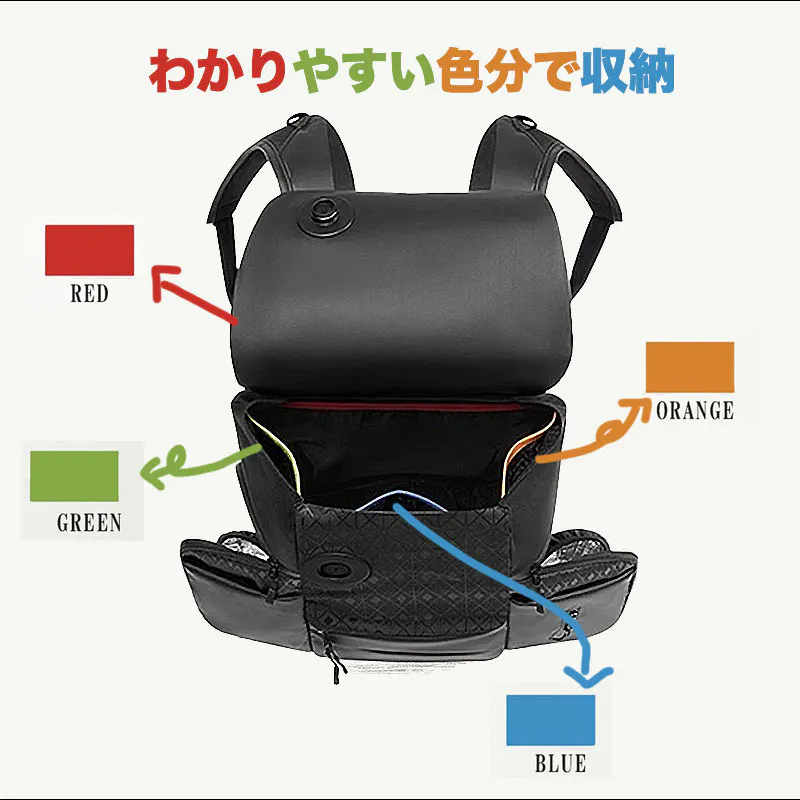 各コンパートメントはカラフルに色分けされ、収納物を一目で識別できます。