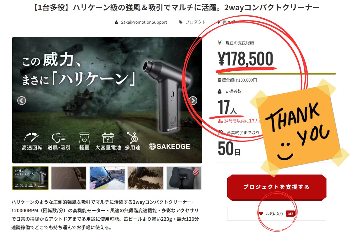 本日、20時よりスタートいたしました「SAKEDGE 2wayコンパクトクリーナー」プロジェクトは、皆様の温かいご支援のおかげで開始16分で目標ご支援額を達成することができました!