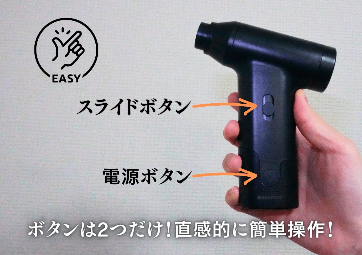 画像を見ていただいて分かる通り、本商品には電源ボタンとスライドボタンのみが搭載されており、それ以外のボタンは存在しません。
