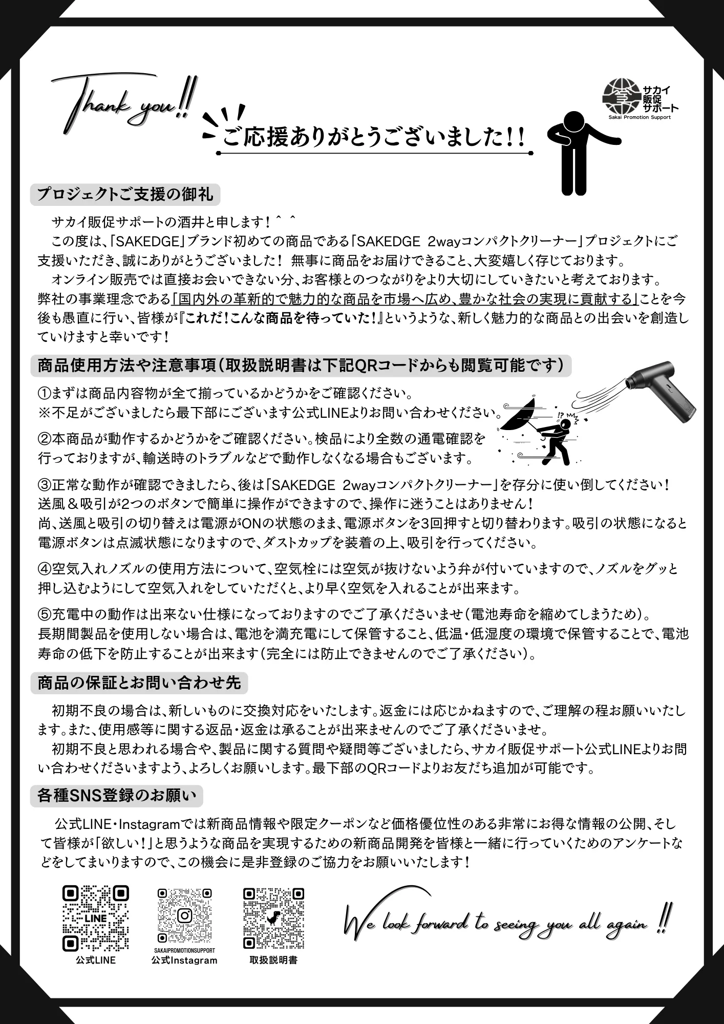最後になりますが、皆さまの手元に「SAKEDGE 2wayコンパクトクリーナー」が無事に届き、日常的な掃除や趣味などにご使用される姿を想像すると、非常に胸が熱くなる想いでございます...!!