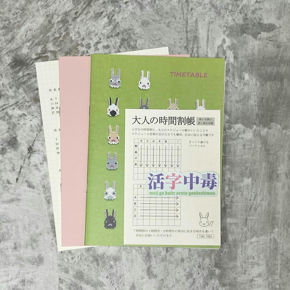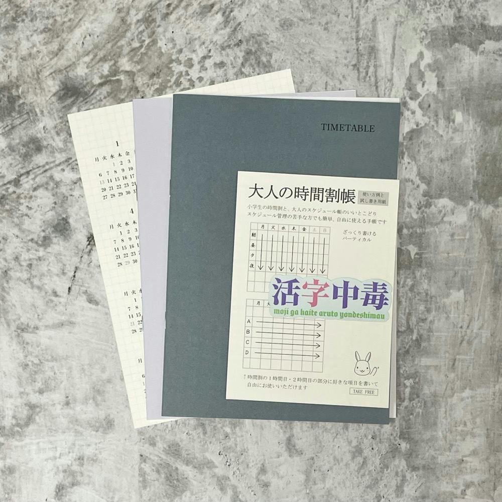 活字中毒ステッカーつきのお得な大人の時間割帳セットを4月10日まで通販で販売していますので、よかったらそちらもご覧いただけますとうれしいです。