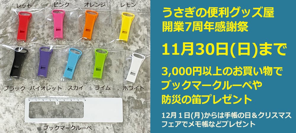 2025/10/31 12:05昨年はクラウドファンディングで大人の時間割ダイアリーの製作をご支援いただきまして誠にありがとうございます。ただいま、大人の時間割ダイアリーは、公式通販「うさぎの便利グッズ屋」で販売しております。11月30日まで、開業7周年感謝祭でノベルティもプレゼントしております。また、11月には東京で3日間連続でイベント出店をして、オフ会も開催します。その件についてお知らせいたします。***********************************【10月17日(金)21時から通販で開業7周年感謝祭を開催!3,000円ごとにノベルティプレゼント】うさぎの便利グッズ屋では、9月13日の開業7周年を記念して、11月30日(日)まで開業7周年感謝祭を開催しております。11月30日までの期間中、お買い上げ3,000円「ごと」に、ノベルティをプレゼントします。送料・支払手数料・ダウンロード販売は除く、品物3,000円ごとにプレゼントです。3,000円以上のお買い物で1個、6,000円以上のお買い物で1個、9,000円以上のお買い物で3個……となっております。大人の時間割ダイアリーでしたら、4,800円なのでノベルティは1個です。プレゼントはブックマークルーペと防災の笛サイコールがございます。プレゼントはこちら↓【開業7周年記念】3,000円のお買い物『ごと』に選べるプレゼント 11/30までhttps://usabenri.shop/items/66c9e4ad7dd1ee243144950f今回は送料無料はありません。あとちょっとでプレゼントがもう1個の時のために、500円以下の品物を集めたページもございます。https://usabenri.shop/?category_id=5d938d10745e6c678e937759100円からございますのでご利用くださいませ。昨年製品化をご支援いただきました「大人の時間割ダイアリー」はこちらです。↓https://usabenri.shop/items/66c65dca1685c91457418cd0大人の時間割は分冊タイプもございます。本文用紙は同じく淡クリームキンマリで、時間割枠のデザインも同じ、分冊タイプ(ノートくらいの厚さ)は製本が針金(中綴じ)となっております。1年1冊のタイプを「大人の時間割ダイアリー」で、分冊タイプは「大人の時間割帳」という製品名で販売しております。分冊タイプの、年間4分冊(1冊3か月書けます)は、表紙が2種類ございます。↓https://usabenri.shop/?category_id=5eeaf4ead3f167241bfe8849大人の時間割帳 アッシュの表紙は、ファンシーペーパーの ディープマット アッシュ 180kg/m2を使用しています。青みがかったグレーで、シンプルな表紙です。お仕事用にも使いやすいデザインのノートタイプの手帳です。大人の時間割帳 うさぎのがっこう は、表紙がフルカラーオフセット印刷。図鑑に載っている実際の品種のうさぎを、ビーズアーティストの3Dよーこさんに1匹1匹編んでいただき、撮影した写真を表紙にしています。年間12分冊タイプもございます。↓https://usabenri.shop/?category_id=5eeaf4fe561e172a0b822eeaこちらはもともと、初回の2017年のクラウドファンディング時に、世の中にないものを作ったので、来年からの大人の時間割帳を今年の間からお試し使いしていただくために無地の表紙の1か月用を作りました。そして周りの方におすすめいただけるように、使い方が載った雑誌のようなデザインの表紙の1か月用を作りました。ノーとは最初の数ページだけ書いたものがいくつも残ることがありますよね。たった7枠の大人の時間割帳も、少しだけ書くのにとても便利だったので製品化しました。表紙が増えるとお値段が高くなるけれどしっかりした厚手の紙を使用したいのと、用途によって色分けがしやすいように、表紙は紀州の色上質紙の超厚口を使用しています。私はスケジュール管理以外に、イベント出店時の値札を貼り付ける土台や、イベントのブースの配置図を描く時に、薄くて便利なのでこの12分冊タイプを使用しています。これからの大掃除の計画表作りや師走の繁忙期の管理をするなど、サブの手帳としても便利です。大掃除などの計画や、出先で持ち歩く際に見開きの1枚だけでいい場合は「大人の時間割リーフ」という、製本前の本文用紙のような大人の時間割もございます。↓https://usabenri.shop/?category_id=5eeaf516d3f1672309fe8812来年も、大人の時間割がお役に立てましたらうれしいです。12月1日からは、手帳の日&クリスマスフェアを開催します。ノベルティは、セビロスリムメモ、または、ロゴ入りマイルドライナーです。こちらは3,000円「以上」のお買い物で「1個」のプレゼントです。(12月の方は何円買ってもプレゼントは1個です)セビロスリムメモは、本文用紙が大人の時間割の淡クリームキンマリと同じで5mm方眼の、薄いメモ帳です。たくさんお買い物をされる方は、今の11月の感謝祭が、プレゼントがたくさんでお得です。お買い物が大人の時間割ダイアリー1冊のみの方は、お好みのノベルティがある時期のお買い物がおすすめです。***********************************【今年秋は、東京の実店舗やイベントで、一部の大人の時間割を直接お求めいただけます】<実店舗>・とにかくうさぎが好き(吉祥寺)<イベント>2025年・11月22日(土) ファストフェス3(西日暮