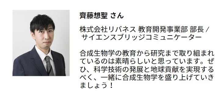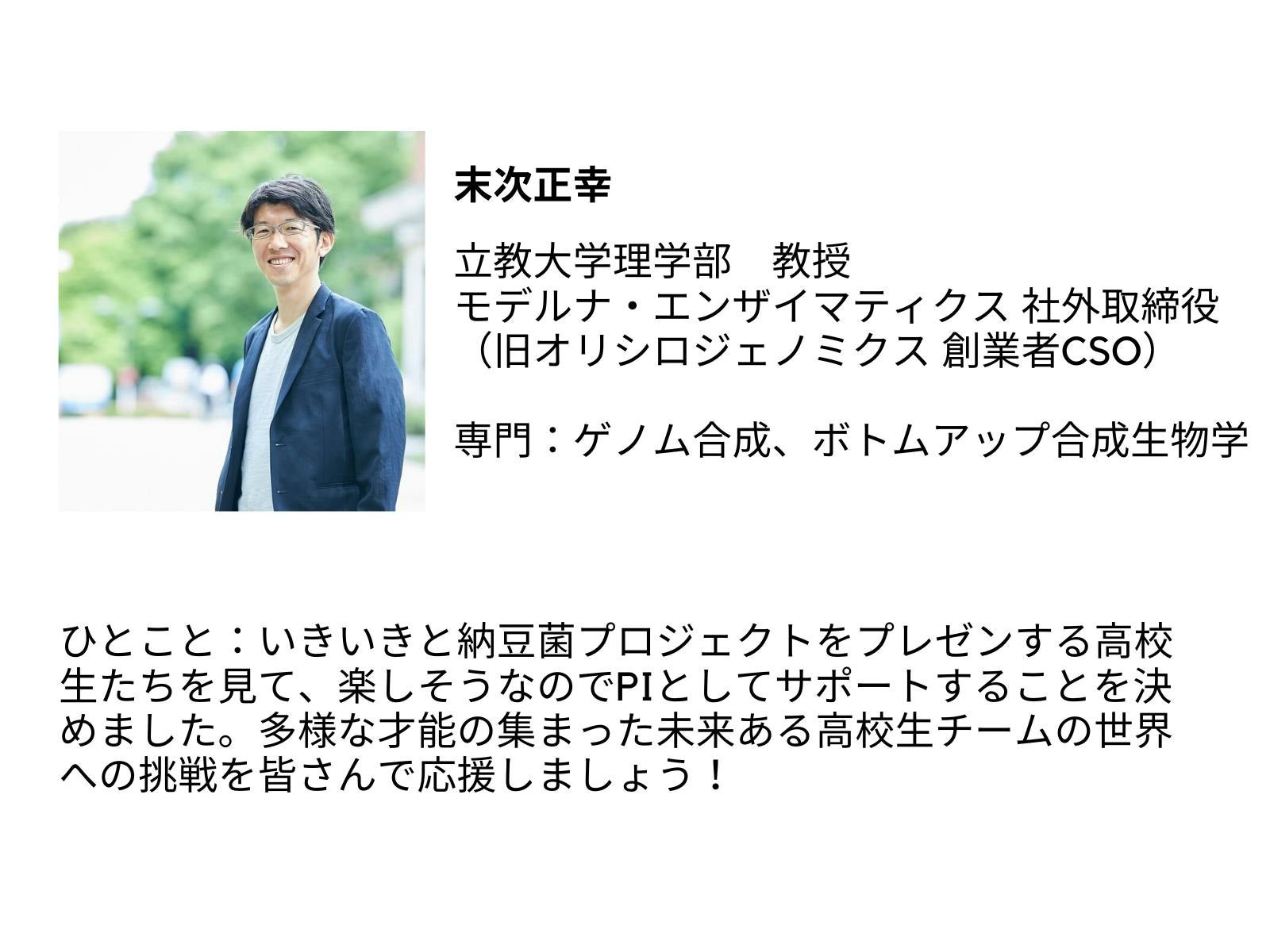 また、今回実験は立教大学理学部末次研究室にて行います。末次先生は「生命とかなにか」というテーマのもと研究に取り組まれており、昨年度の高校生優勝チーム「Japan-United」の実験を監督した先生です。モデルナが買収した企業「オリシロジェノミクス」の創業者としても幅広くご活躍されています。末次先生のご紹介、コメントは以下の通りです。