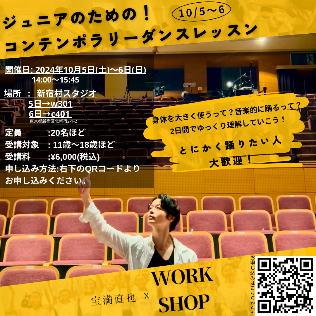 2024/09/13 13:54皆さまこんにちは、宝満直也です!着々と渡独への準備を進めていっている最中ではありますが、WSのお知らせをさせていただきます。「ジュニアのためのコンテンポラリーダンスレッスン!」開催が決定致しました!残りあと4名となっておりますので、もしご興味があるジュニアの方、またはお知り合いのジュニアの方がいらっしゃる場合はお知らせください![日時]2024年10月5日(土)~6日(日)14:00~15:45 [場所]新宿村スタジオ10/5(土)→w30110/6(日)→c401[受講対象]11歳~18歳(対象年齢外でも挑戦したい方はお問合せください)2日間ご参加できる方[定員]20名程度[受講料]¥6,000(税込)お申し込みは写真のQRコードよりお申し込みいただけます!もしくはこちらのcampfireからメッセージお願い致します。今までと同じく2日間開催になります。1日目に振り入れをして、2日目に続きを入れて更にブラッシュアップしていき、最終的に音楽で踊れるようにしていきます。舞台で大きく見えるには? どう表現したらいい?など僕なりのアプローチで何か得ることができるような時間になることを目指しています。僕がドイツに行く前の最後のW.Sになりますので、是非いらしてください!!一緒に楽しみましょう!いつもありがとうございます。宝満直也 もっと見る「感謝のメッセージ動画」