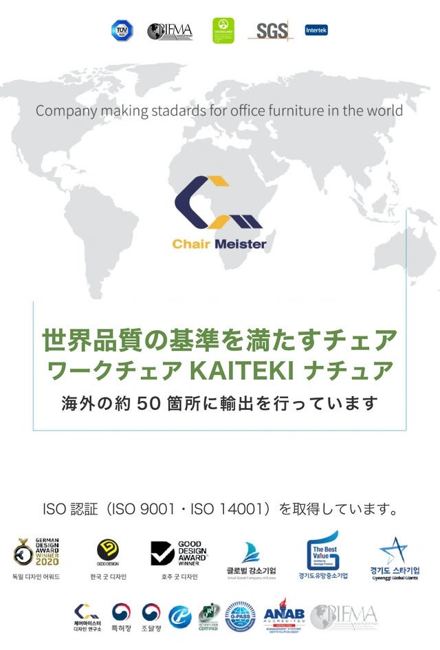 この度、韓国のチェアマイスター社と日本独占契約を締結し、「ワークチェア KAITEKI ナチュア」の日本先行販売が実現できる運びとなりました。このプロジェクトより日本での展開を積極的に進めてまいります。最後まで宜しくお願いいたします。