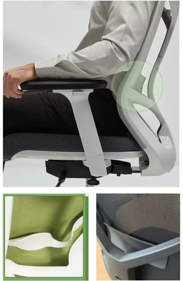 A3.「ワークチェア KAITEKI ナチュア」は腰を優しく支える仕組みが2つあります。可動式ソフトランバーは柔らかいプラスチックで、異なる姿勢や腰のカーブに合わせてフィット。腰全体を優しく支えることで、自然なS字カーブを保ちます。さらに新技術、Cカーブサポートは、背骨を圧迫せず、密着させる仕様。腰を優しく支え、腰への負担を軽減します。