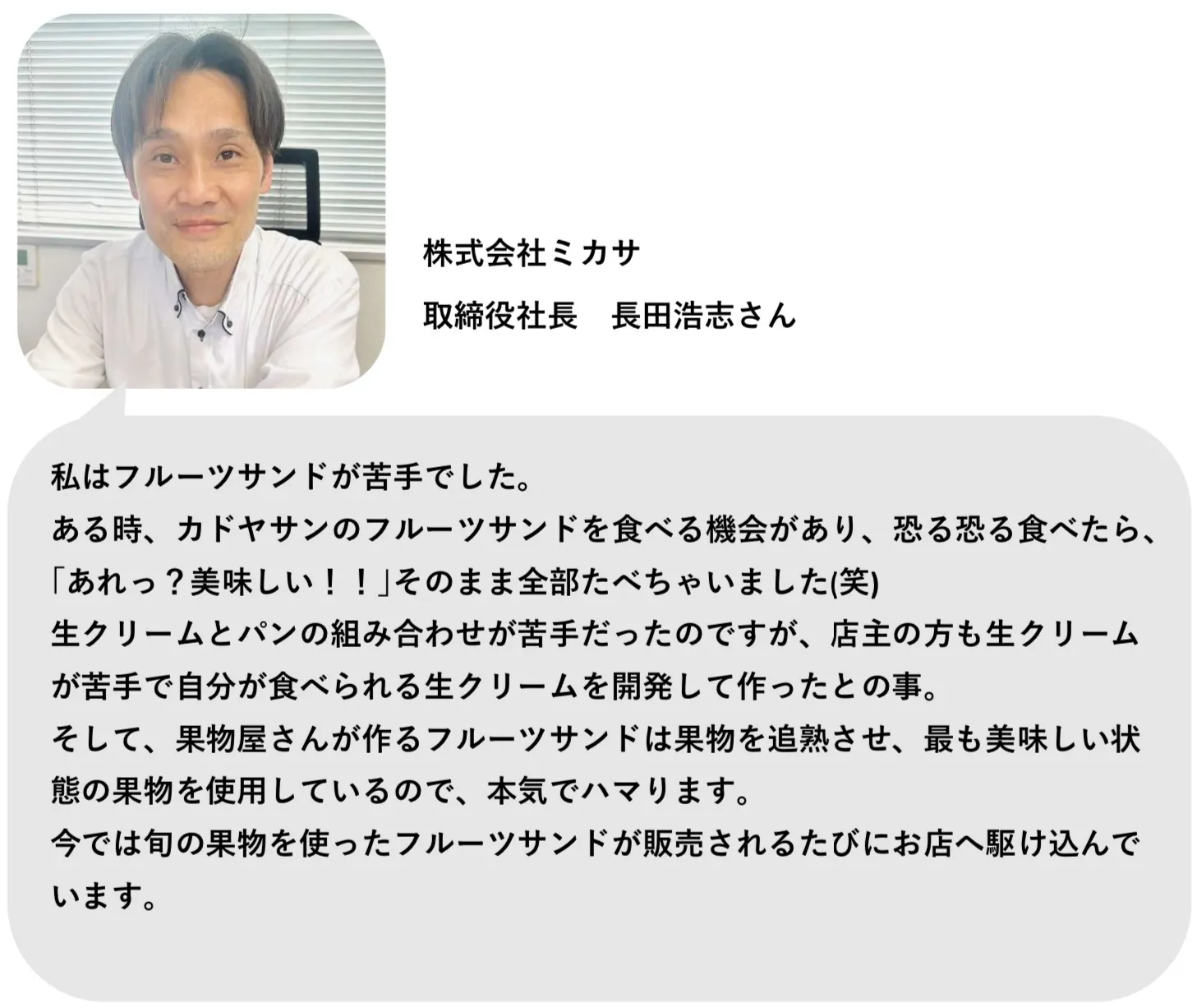 今後もカドヤサンのフルーツサンドをたくさんの方に食べてもらいたいと思っています!応援よろしくお願いします!