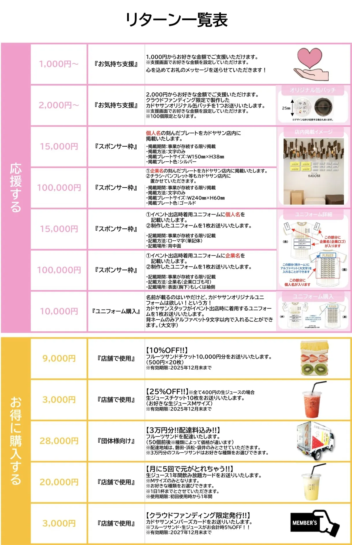皆さまからいただいた支援金は、当プロジェクトの実施費用、『カドヤサン』展開への新店舗開業費用に充てさせていただきます。
