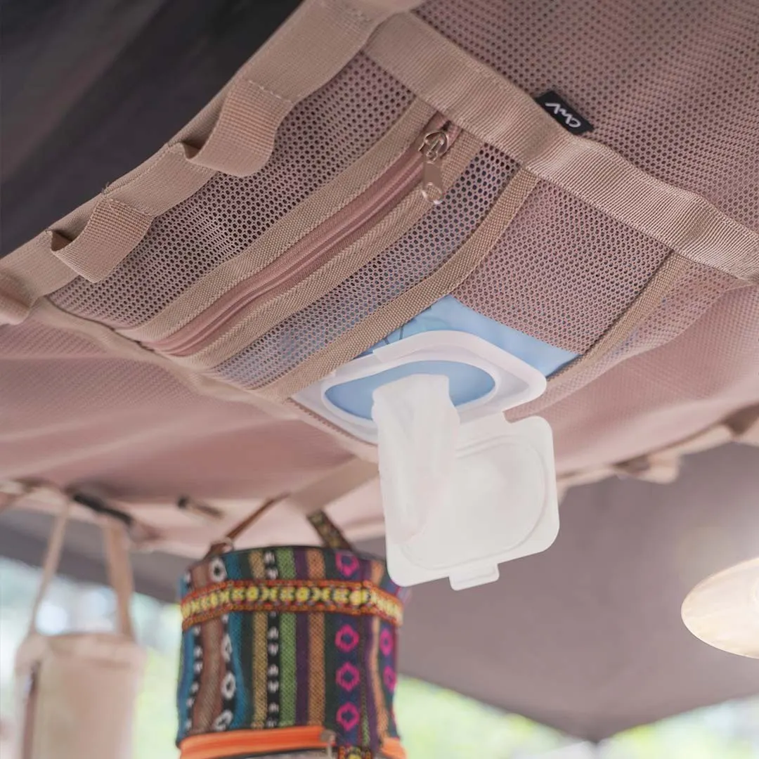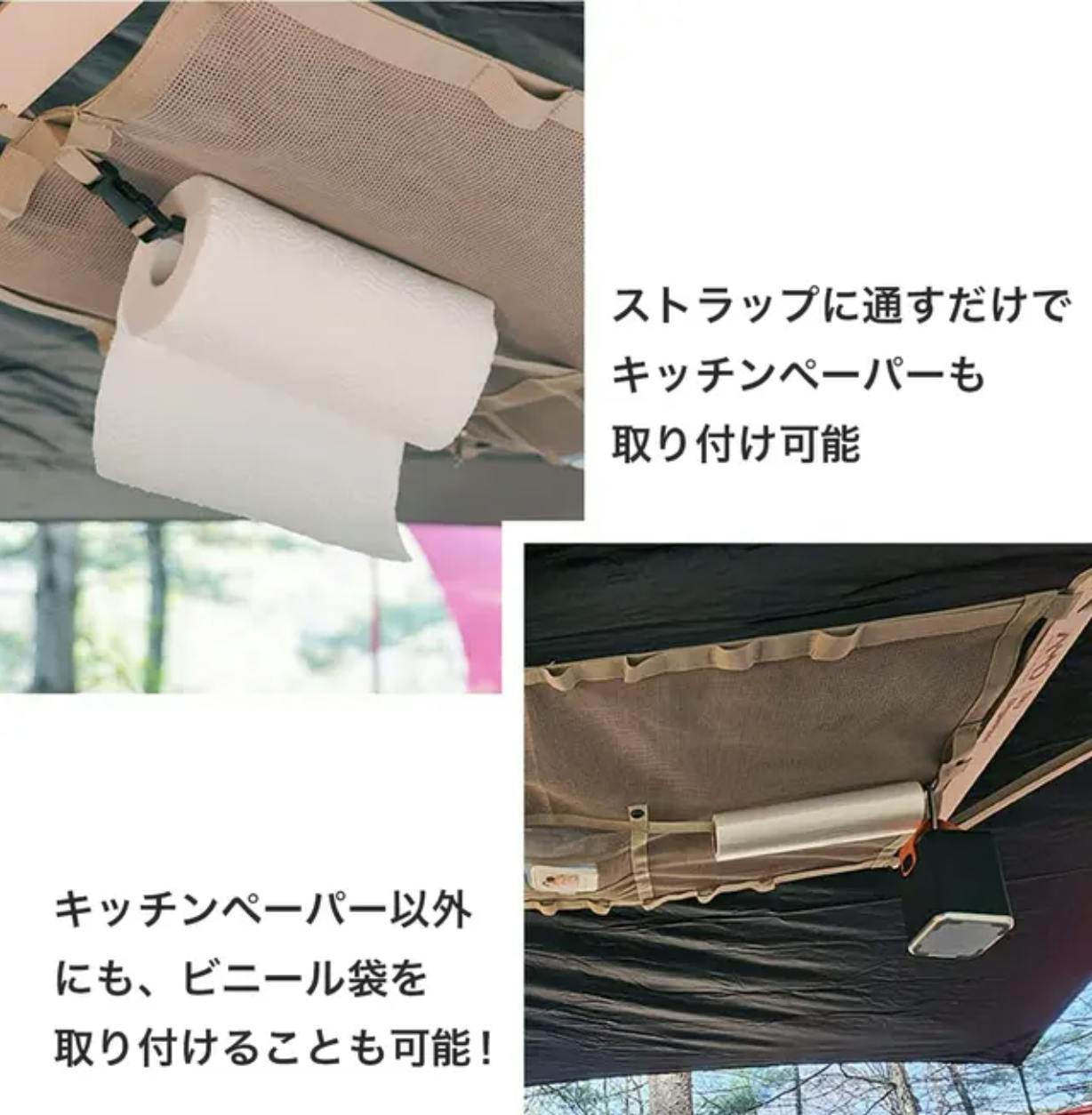 頭上のデッドスペースを活用できるのはもちろん、ウェットティッシュやキッチンペーパー、アウターなどお好きなものを収納していただけるため、ソロキャンプはもちろん複数人でのキャンプにも最適です。