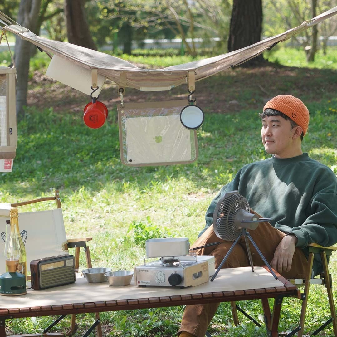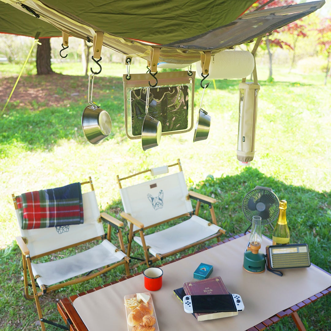 頭上のデッドスペースを活用できるのはもちろん、ウェットティッシュやキッチンペーパー、アウターなどお好きなものを収納していただけるため、ソロキャンプはもちろん複数人でのキャンプにも最適です。