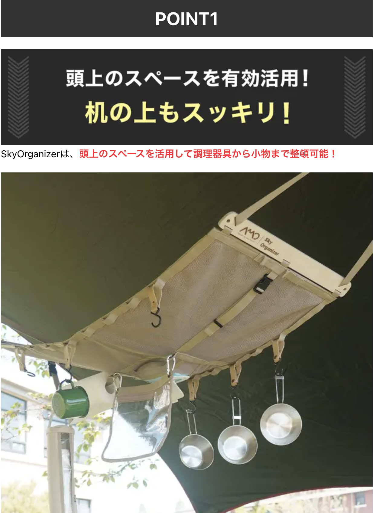 今回のSky Organizerは、収納面に非常に優れており、多機能でキャンプシーンをより豊かになる製品だと確信しています。