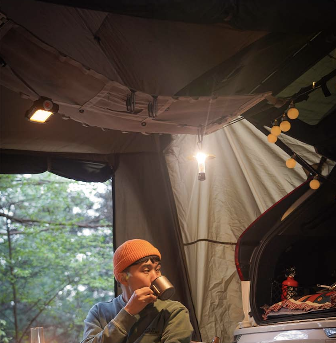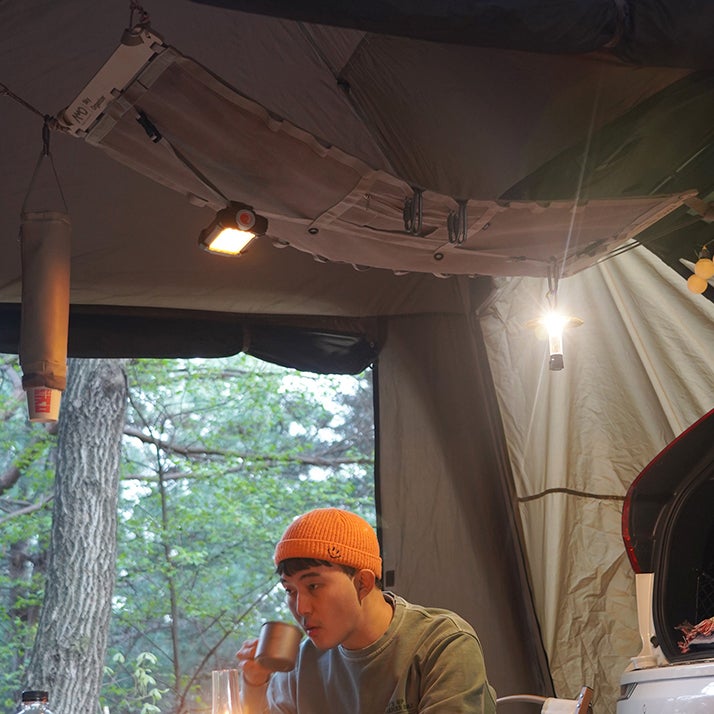 夜はランタンをひっかけるだけで、ムード満点のキャンプに大変身。