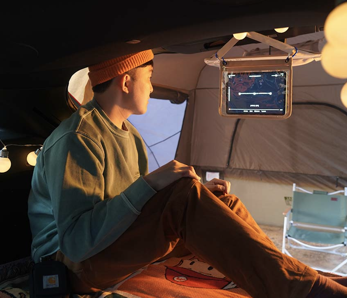 カラビナでタブレットケースを設置するだけで、キャンプの楽しみ方が広がりますよ!