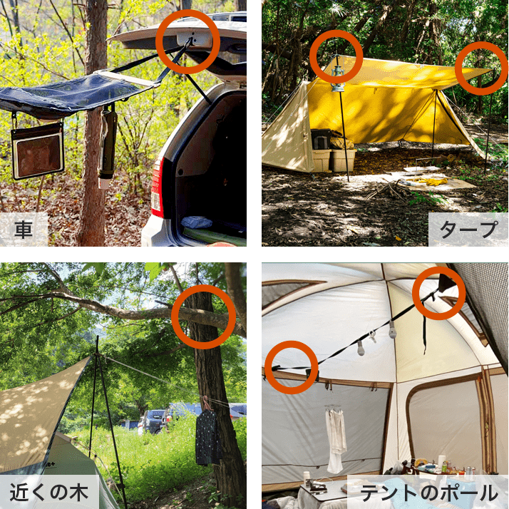 ①机の上・テントの中など、頭上のスペースを有効活用!