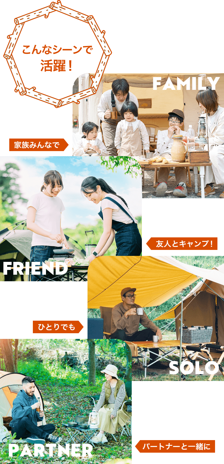 テントの色とも馴染みやすく、オシャレなキャンプを演出します。
