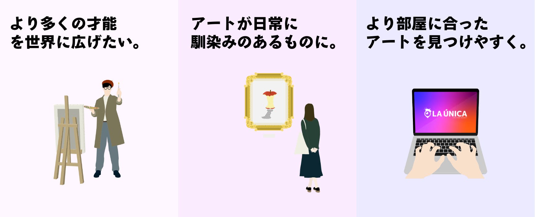 アーティストにはLAUNICAを通して才能を世界に広げて貰うこと。ユーザーにはラウニカでお部屋の雰囲気に合った様々なアートをお手軽に手に入れてもらい、日常にアートが寄り添うようなサービスを提供することを目指しております。
