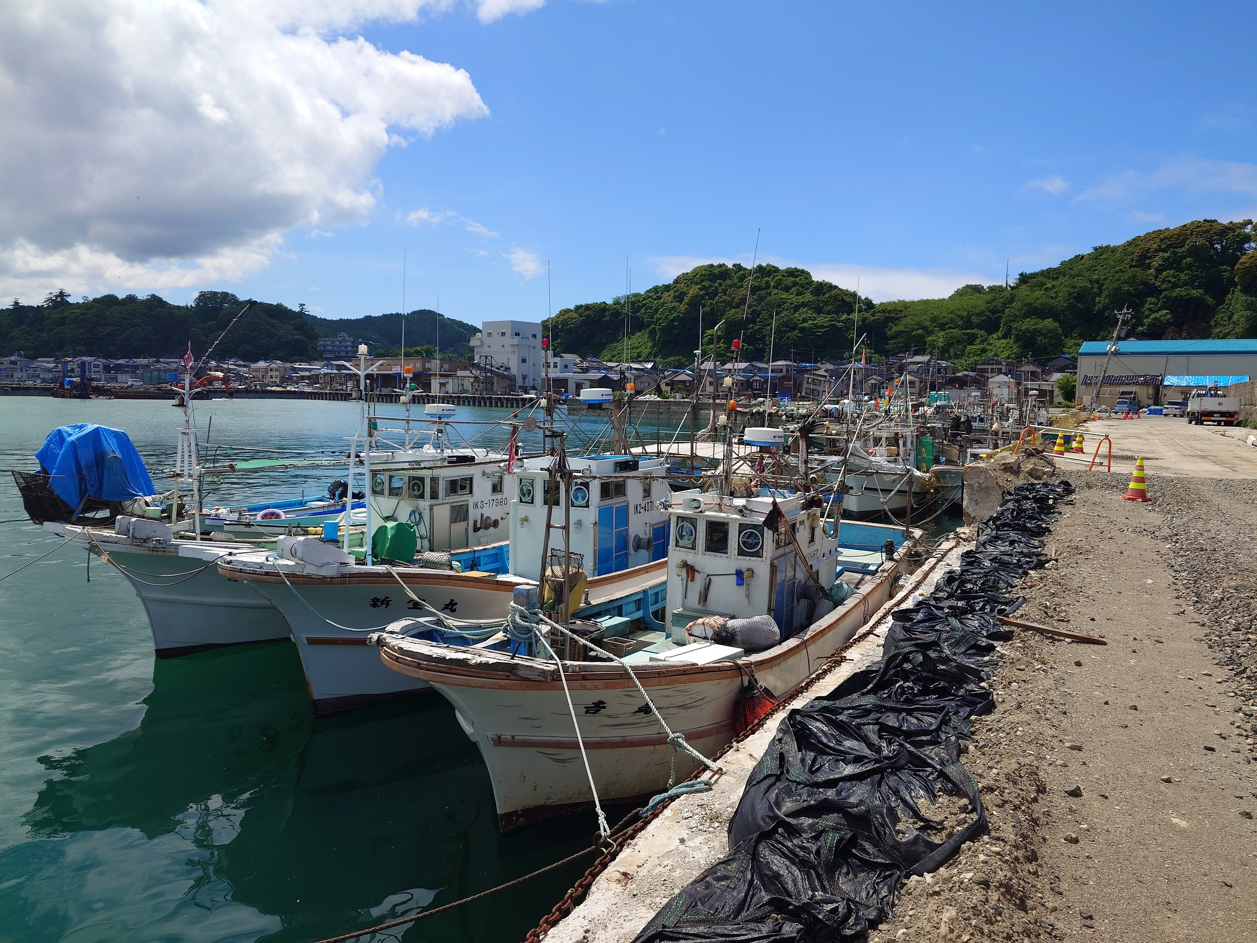 応援ありがとうございます!だんだんと暑い季節になってきました。北陸地方はいつもより遅れている梅雨も影響してるのか、今日は特別に暑い輪島です。前回の緊急点検でエンジンがかからず点検できなかった船に行ってきました。ちょうど寿命だったバッテリー交換交換したのが、平成29年となると7年目。こんな大きなバッテリーでも寿命は8~10年。ほとんど毎日沖へ出る夏場なら大丈夫だったけど、たまにしか出漁しない冬場は危ないなぁと思っていた時にこの地震。船主さんは1月以来、避難所暮らしで5ヶ月近く輪島におられず、エンジン始動もできなかったようです。それでも私が行くと笑顔で「お前がいると助かるわぁ~」と一言。その言葉に勇気づけられてきました!浚渫(しゅんせつ)工事はいつ終わる?それでも例えエンジンがかかって計器類がまともだったとしても港の中はこんな状態で、自力で動ける船を優先的に移動し、自力ではどうにもこうにもならない船を巨大クレーンで吊り上げて邪魔にならない場所まで移動するようです。そして港内を空けたうえで浚渫工事(安全な海の道をつくるために浚渫船という船を使って海底の土砂をすくい取る工事)をはじめるとのこと。まだ100隻近くの船がいるのに、まったく何時になるのか見当がつきません。。。