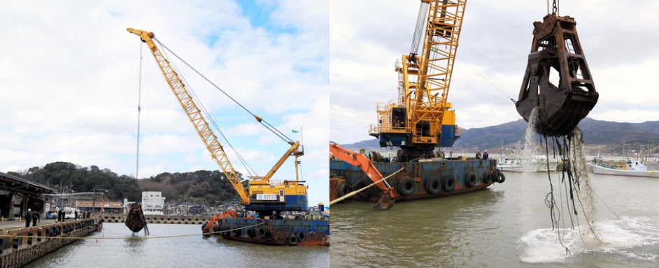 クレーンで土砂を取り除いている様子